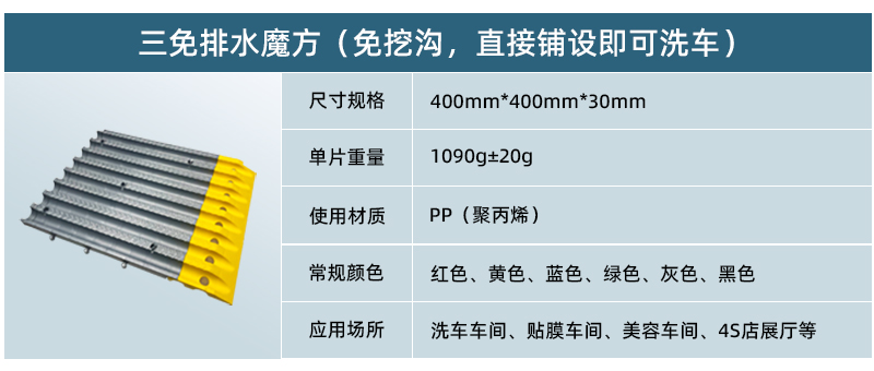 三免排水魔方由主體格柵、正邊條、反邊條三部分構(gòu)成,通過雙層卡槽設(shè)計相互扣接,便于流水清污,易于安裝,即可快速構(gòu)建起堅實的洗車地板地面,主要適用于不能開水槽的場所。