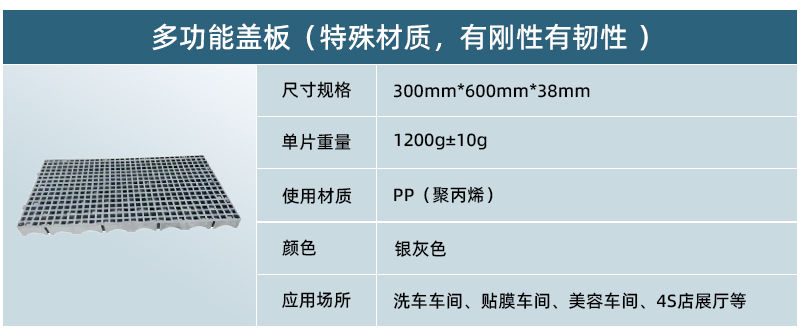 1、 超強耐壓,是唯一一款可以上大貨車,工程車,消防車等重型車輛的洗車格柵。 2、 可以懸空鋪設(shè),在跨度15CM以內(nèi)提供質(zhì)保。 3、特殊材質(zhì),有剛性有韌性。 4、外觀為小孔玻璃鋼款式,防高跟鞋。 5、平鋪后四周可以鋪瓷磚,應(yīng)用于高檔三膜店,金屬質(zhì)感,高檔豪華。 6、可以橫豎交叉鋪設(shè),鎖扣均可扣接。 7、 應(yīng)用廣泛,隨意搭配,美觀實用。
