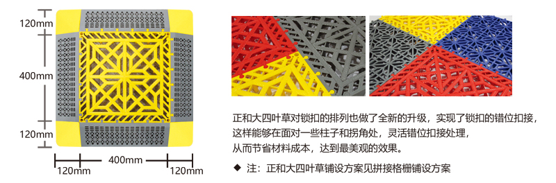 正和大四葉草采用通扣設(shè)計(jì),可以確保產(chǎn)品鋪設(shè)完成后在任何區(qū)域單獨(dú)取出,極大的方便了客戶后期局部清理泥沙等,給店面的日常衛(wèi)生維護(hù)提供了很好的基礎(chǔ)。