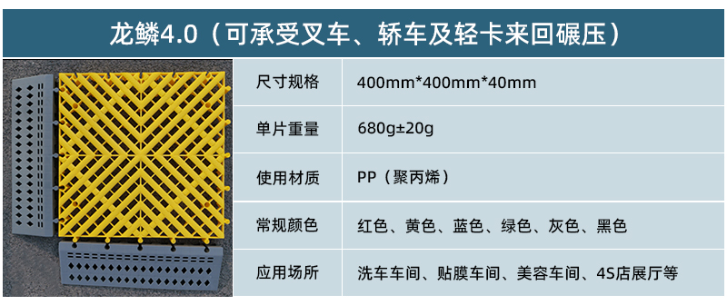 1.龍鱗紋設(shè)計(jì),防滑,美觀,寓意好 2.選用高級(jí)原料,加入其他輔料,顏色亮麗,無(wú)異味,無(wú)污染 3.顏色為紅黃藍(lán)綠黑灰六色,滿足客戶用色需求,搭配屬于自己的風(fēng)格 4.通扣鎖扣設(shè)計(jì),容易鋪設(shè)且容易拆卸打理 5.加強(qiáng)支撐,不容易出現(xiàn)壓壞壓斷現(xiàn)象,滿足大多數(shù)車輛施工的要求 6.使用年限長(zhǎng),3年超長(zhǎng)質(zhì)保,使用無(wú)后顧之憂 7.不同厚度,采用不同支撐,保證承載最大化的同時(shí),且易排泥排水