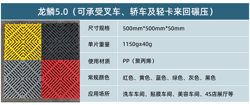 1.龍鱗紋設(shè)計(jì),防滑,美觀,寓意好 2.選用高級原料,加入其他輔料,顏色亮麗,無異味,無污染 3.顏色為紅黃藍(lán)綠黑灰六色,滿足客戶用色需求,搭配屬于自己的風(fēng)格 4.通扣鎖扣設(shè)計(jì),容易鋪設(shè)且容易拆卸打理 5.加強(qiáng)支撐,不容易出現(xiàn)壓壞壓斷現(xiàn)象,滿足大多數(shù)車輛施工的要求 6.使用年限長,3年超長質(zhì)保,使用無后顧之憂 7.不同厚度,采用不同支撐,保證承載最大化的同時(shí),且易排泥排水